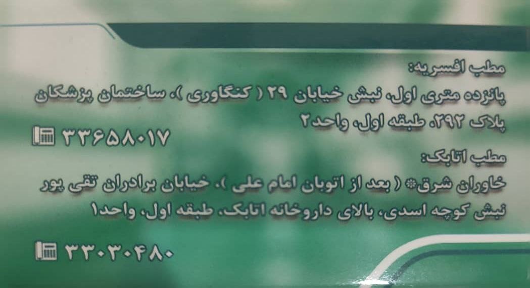 ●جراحی سطحی پوست ●ختنه(جراحی-حلقه) ●سوراخ کردن گوش(گوشواره طبی) ●تغذیه ورژیم غذایی ●بوتاکس-مزوتراپی ●پیرسینگ ●ویزیت در منزل با تعیین وقت قبلی ●فعالیت در مطب خصوصی #مطب اتابک: ●خاوران شرق،بعد از اتوبان امام علی،خیابان برادران تقی پور،نبش کوچه اسدی،بالای داروخانه اتابک،طبقه اول،واحد۱